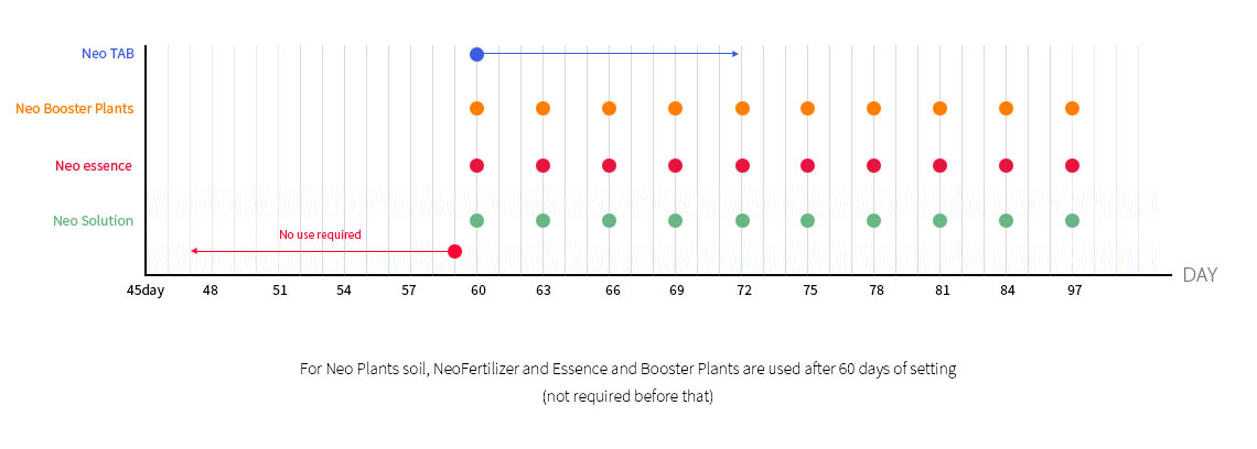 Stimulácia produktmi Neo sa začína na 60. deň od založenia, dávkovanie každý tretí deň počas jedného mesiaca. Tým sa zabezpečí dostatočné posilnenie rastlín pre budúce vývojové fázy. Ďalšie dávkovanie prípravku Neo Boost Plant sa riadi dávkovaním hlavného hnojiva, ak je dávkované spolu s ním.